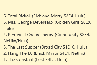 The Case For This Episode: Admittedly, episodes of LOST probably aren’t the best candidate (I hope fans got that reference) to watch as one-offs. Built on its overarching mystery, almost every episode (not “Nikki and Paolo” nor “Jack’s Tattoo”) is needed to piece together the puzzle as a whole. While this episode is probably much better with connection to the characters, “The Constant” is a pretty unique bottle episode. Centering around Desmond, this episode puts a unique twist on time-travel. Desmond’s consciousness becomes “unstuck in time” and the show’s trademark flashbacks happen in real-time. Over the course of this episode we find out that if Desmond doesn’t find a way to merge his separate timelines he’ll die. In order to do so, he must find a constant from both timelines, and no one fit that moniker better than Penny, the love of his life and the “constant” driving force for his character arc. LOST was a show where the characters were often pitted against each other, and almost always in peril. This episode was special because Sayid, Faraday, single-serving character George Minkowski, big bad Charles Widmore, and almost every other person dedicated their efforts to helping Desmond. The empathetic Sayid, a former communications officer from the Iraqi Republican Guard, uses his technological expertise to get Desmond in contact with Penny. We see Penny kept her promise to Desmond, and learn she’s been looking for him this whole time. They confess their love for each other, and then their conversation ends. Penny’s love for Desmond saves his life. It’s so well-acted, and so beautifully written that I’m tearing up just typing about it. This episode of television is perfect. I read the script when I want to feel inspired. Watching this episode never fails to elevate my mood, and that was the whole point of this list. I could watch it 4, 8, 15, 16, 23, or 42 times and it, much like Richard Alpert, just won’t get old.