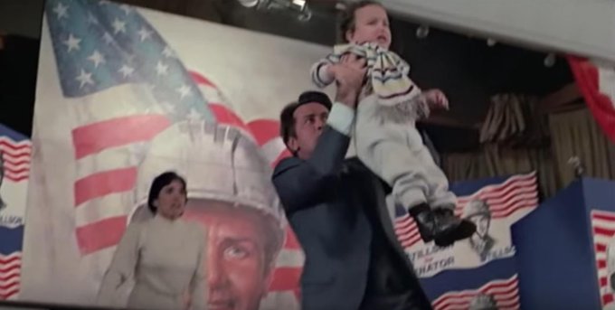 So it’s a bit of a mixed bag here when we break this down. Stillson regales a tale of how he won an election despite his opponents paying black people to vote against him, stating “Take their money and vote for me anyway!” He offers the kind of populist ideals that many can get behind and relate to, creating a coalition of minorities, low-income voters, and the youth. He served in the military, so that’s calming for the Cold War Era this movie was made, and for our current time where WWIII seems to constantly be on the brink. Now, if you believe the psychic premonitions (aka liberal controlled mainstream media) of Johnny, you’d see that Stillson winning his Senate seat is his springboard to the presidency, and ultimately to a nuclear holocaust. Also, the photo above is of him using a child to literally shield himself from bullet fire. Not the best for family values, but we love a candidate who can think on their feet. Election result: Single term only, due to either a failure to deliver on promises and/or apocalyptic atomic war.