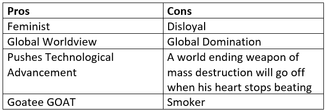 Let’s go piece by piece with this one. Wynn’s top assassin is a woman! This is a field that’s typically male-dominated, so Mr. Wynn is breaking down barriers. He works within the US Military structure as a leader, so those skills will translate well to the presidency. His most famous mission (you know from the movie Spawn that you totally remember) was to destroy a North Korean chemical weapons plant. He created a group that is uber loyal to him comprised of the US Military, the CIA, the Chinese Triads, and the Mafia. Can we say multi-national? I mean sure he wants to take over the world. Sure he linked a device that would kill humanity within 96 hours if he flatlines. No one is perfect. Election Results: He’d win at least a 2nd term, how do you campaign against someone willing to kill all humans if he dies? Also, Wynn sounds like win, and that’s too easy/catchy for campaign slogan purposes.